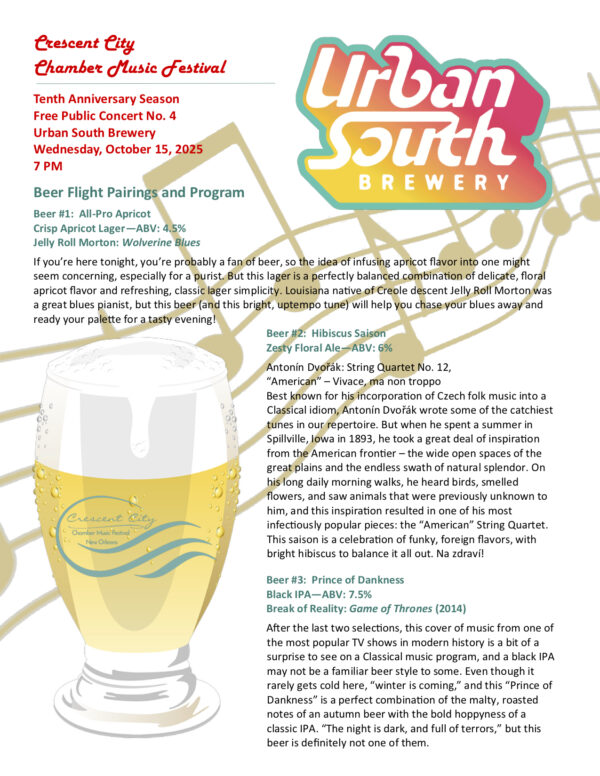 This informal, fan-favorite concert has been on CCCMF’s lineup since our very first season. Special, one-evening only beer flights (available for purchase) from one of New Orleans’ finest (and first) craft breweries are paired with great Classical music performed by CCCMF Festival Artists in the casual, welcoming atmosphere of Urban South Brewery‘s tasting room, with music you won’t hear on any of our other programs!